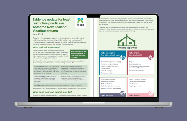 This brief evidence update (10 pages) provides kaimahi with information about the potential impacts on wellbeing and practice, as well as strategies to prevent and alleviate vicarious trauma.