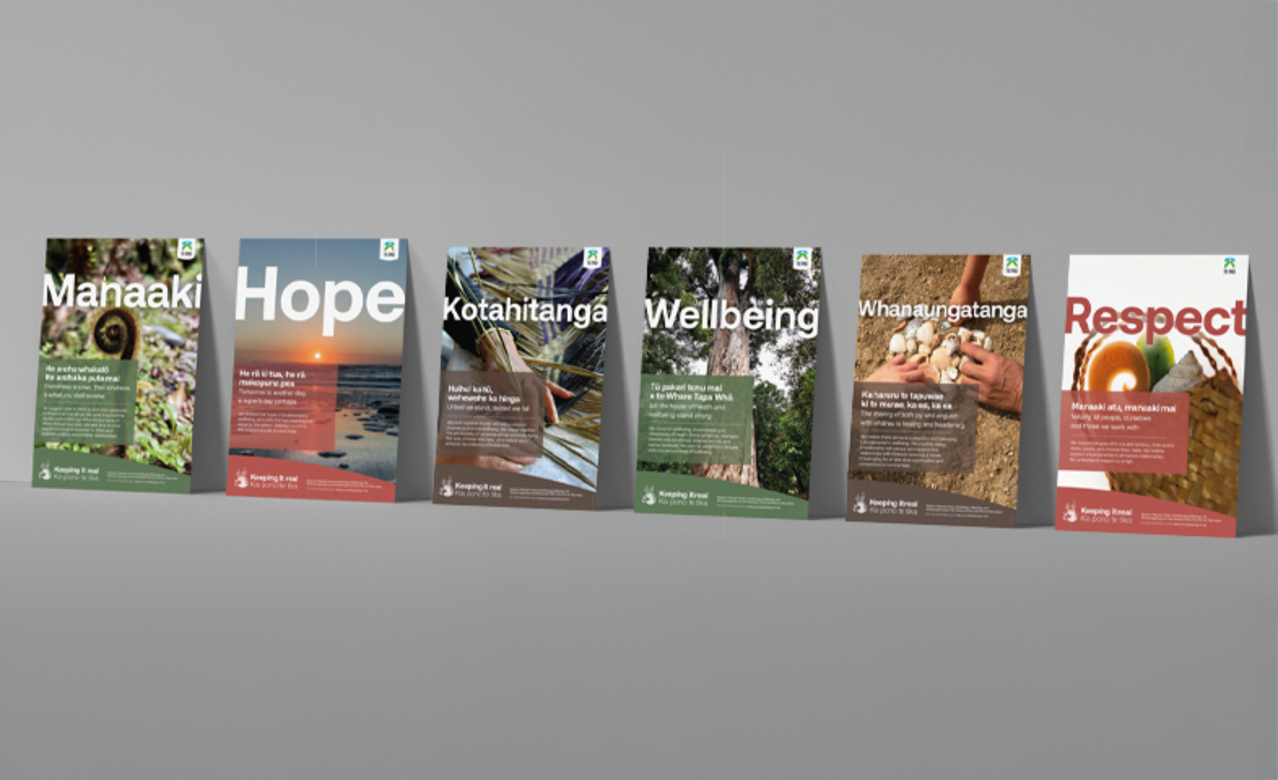 The Keeping it Real | Kia Pono te Tika values posters are a set of six A3 posters that feature the framework values of Manaaki, Hope, Kotahitanga, Wellbeing, Whanaungatanga, and Respect. There is also a set of A6 values cards available.