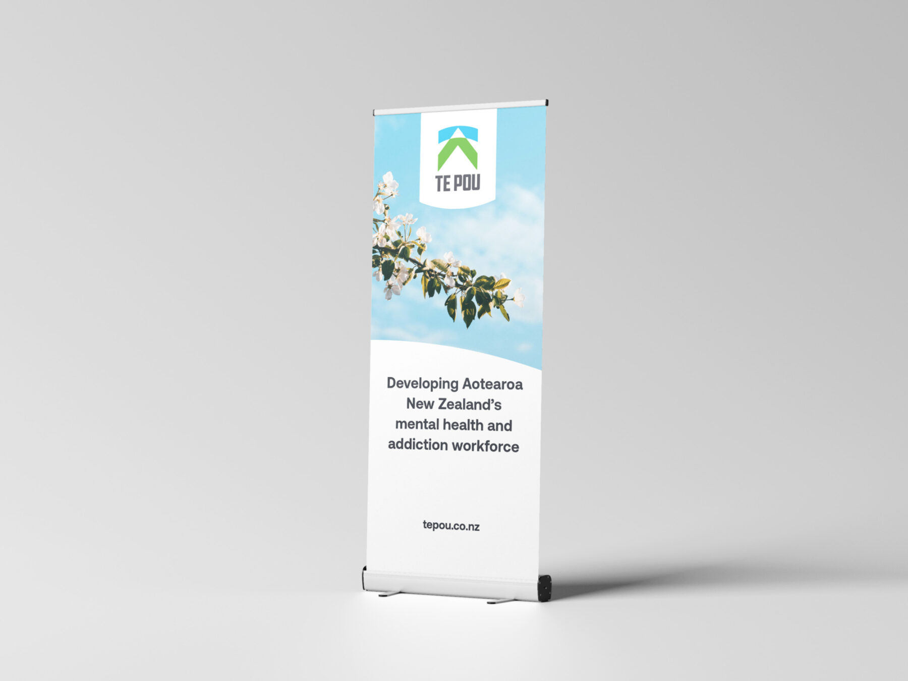 A Te Pou branded pull-up banner. There is also a green version.
