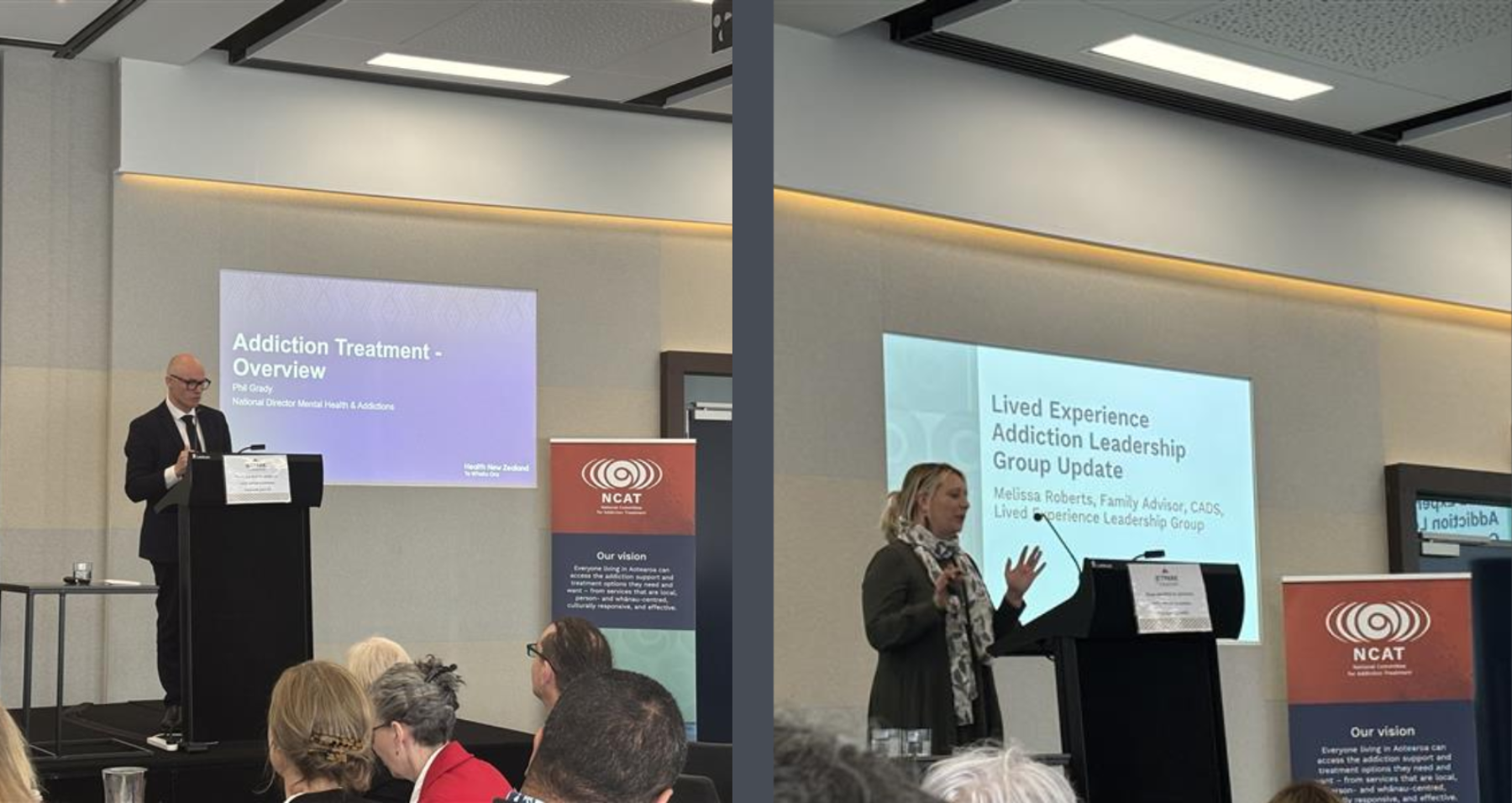 The theme of the day, “He Tirohanga a Muri Ake - Seeing into the future,” was prominent throughout the presentations. Mana Whenua i Tāmaki Makaurau opened the event with an uplifting mihi whakatau, setting a welcoming tone and guiding attendees into the day. Deb Fraser-Komene, NCAT Co-chair, was the MC for the event. In her welcoming speech, she reflected on the broader implications of recovery, “In the context of addiction, we often talk about “recovery.” But recovery must go beyond the individual. Our systems must recover from fragmentation. Our policies from injustice. And our society must recover the belief that everyone deserves treatment, support, and hope — within the context of their story.”